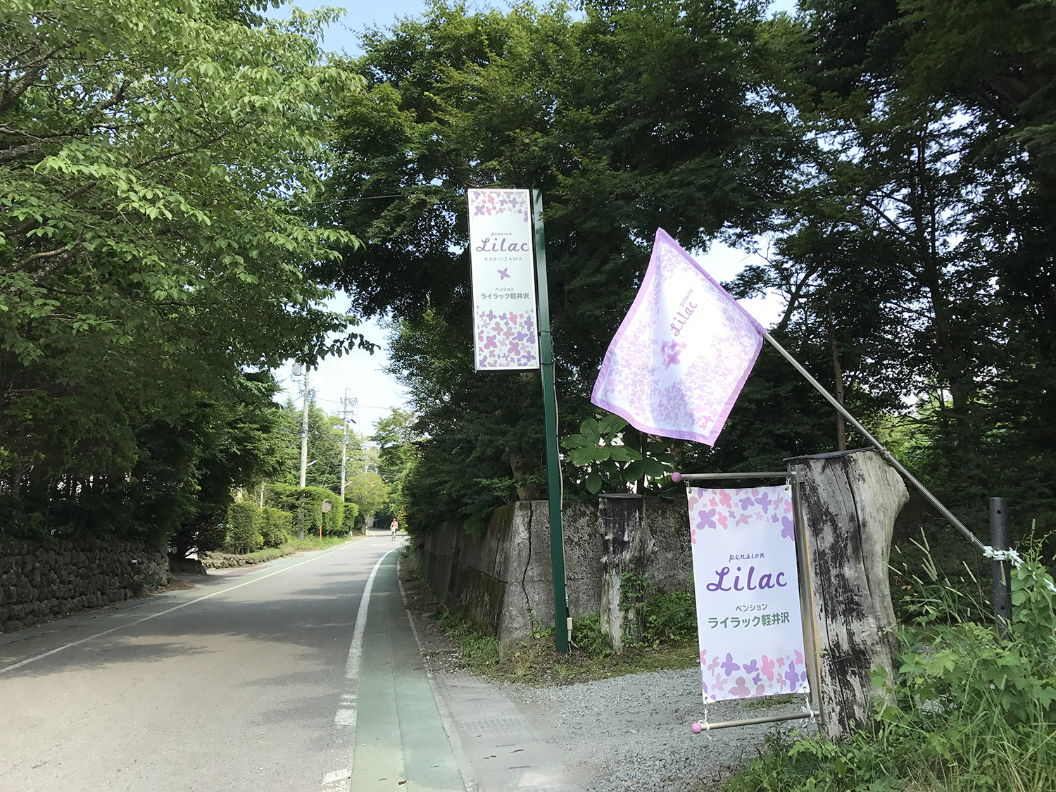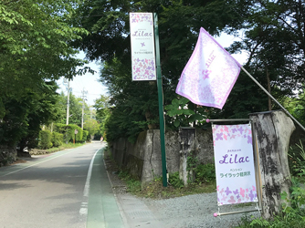 敷地入口の看板とフラッグです。このライラック柄を目印にお越しください。