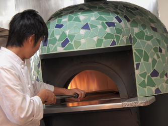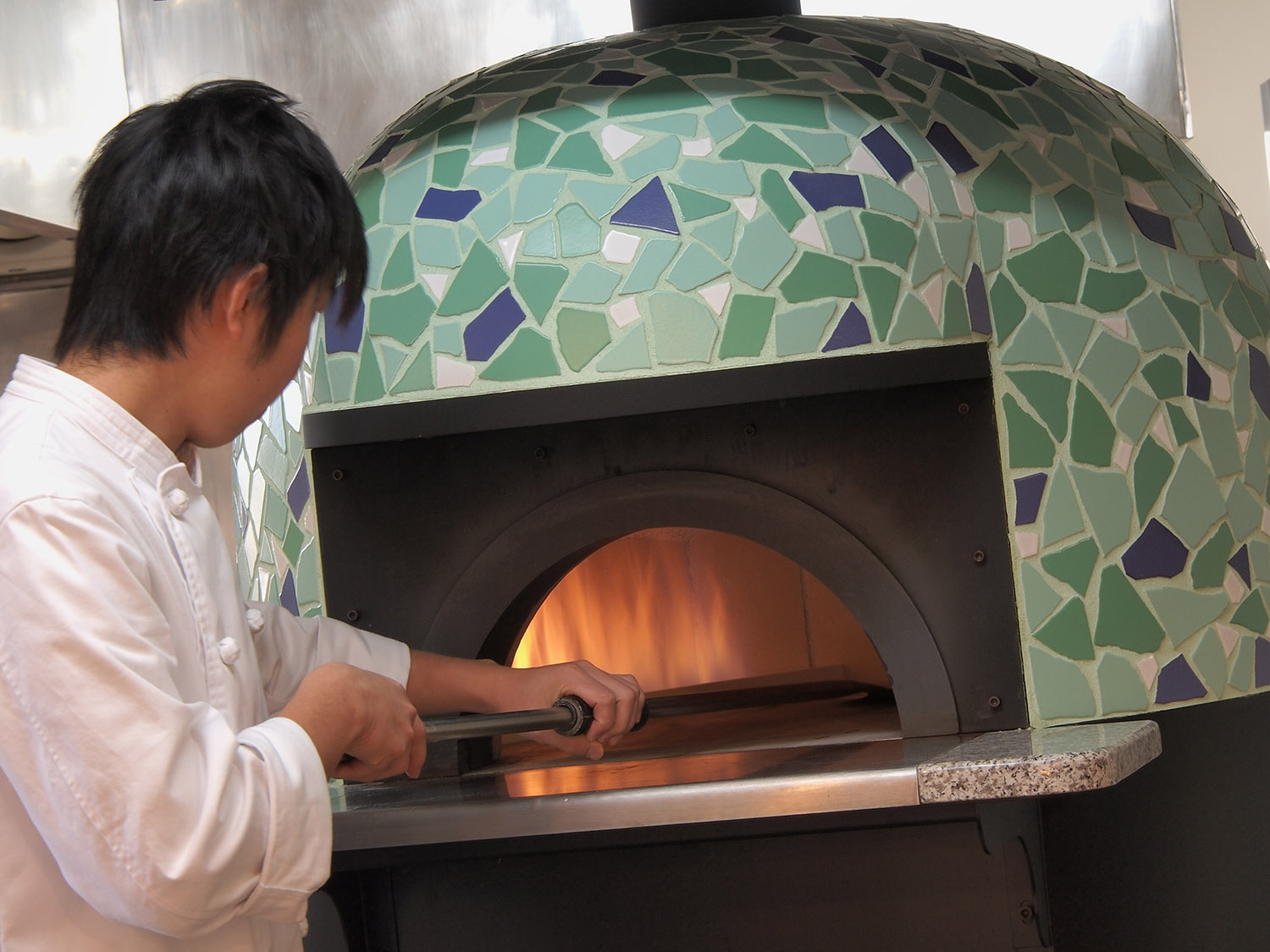 オリジナルのピザ窯は軽井沢の新緑とライラックの花をイメージしました。
