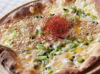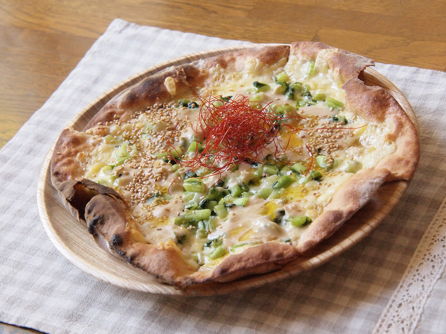 ピッツァの一例。信州の食材、野沢菜と胡麻豆腐のピッツァ。あっさりとした味わいが人気です。