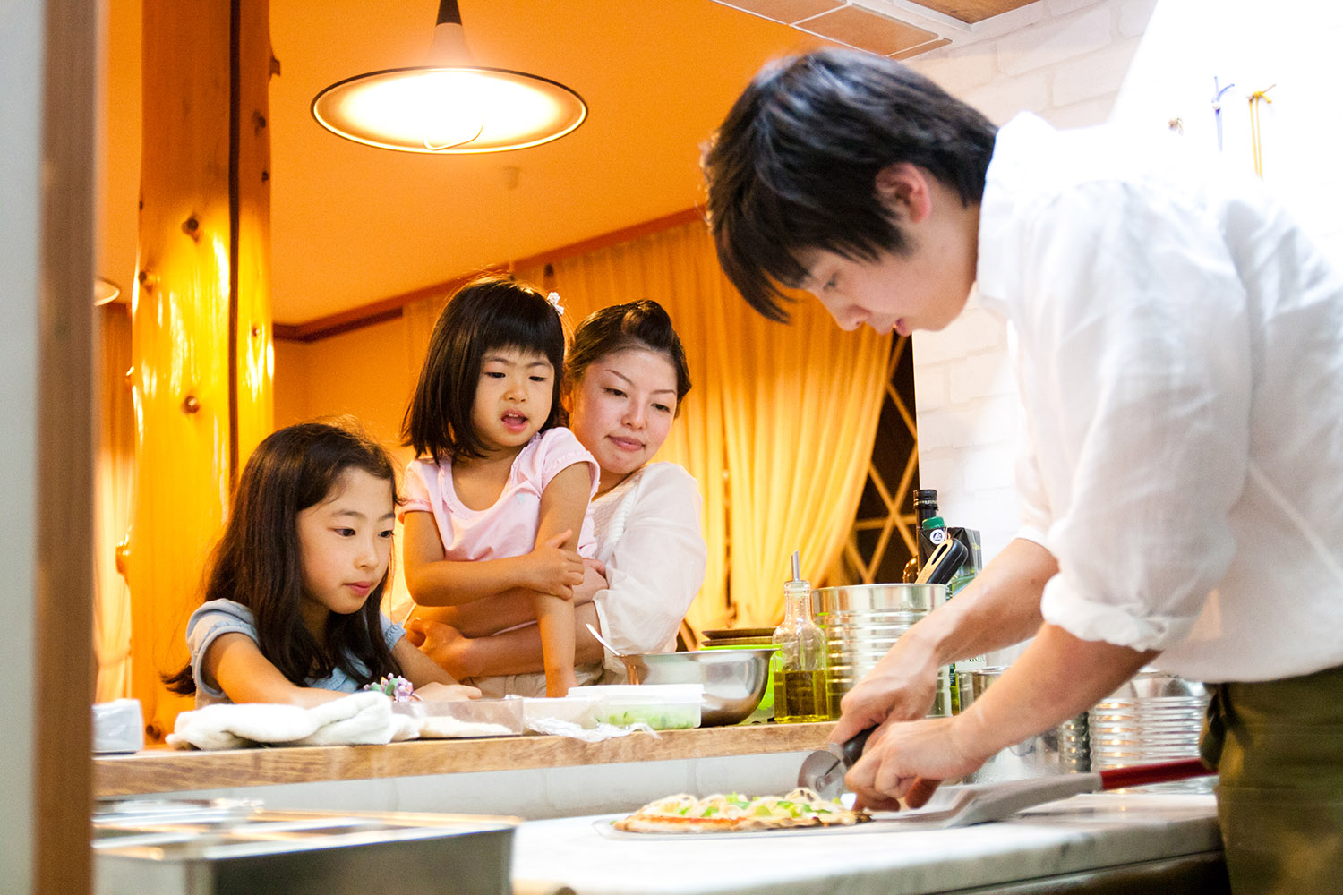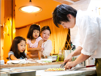 目の前で焼き上がるピザにお子様は興味津々!野菜たっぷりのピザも美味しく食べてくれています♪