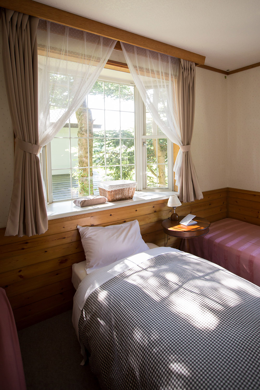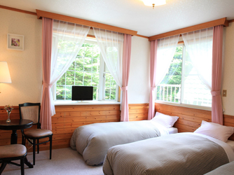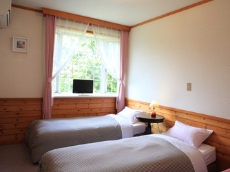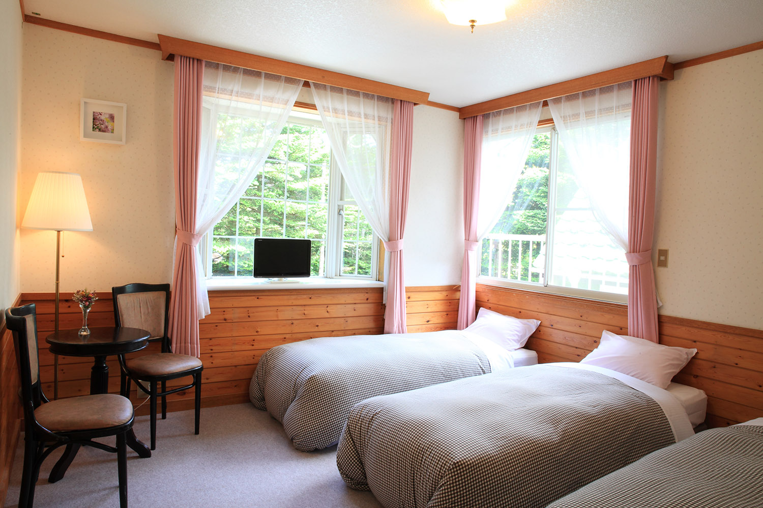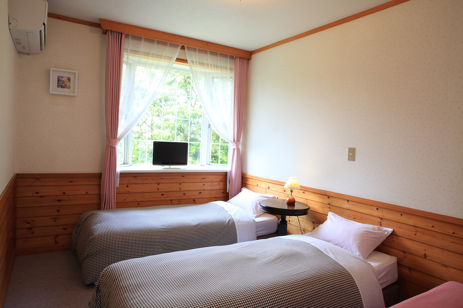 大きな窓が開放的なツインルーム。全室バス・トイレ・エアコン・TV完備です。